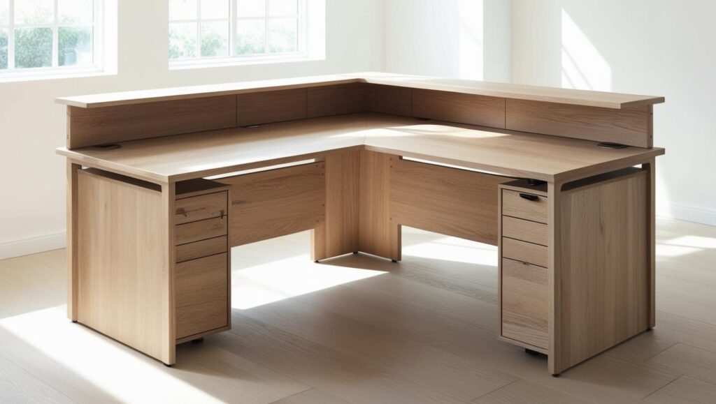 Maximize your workspace with our sleek L-shaped table – perfect for corners and multitasking.